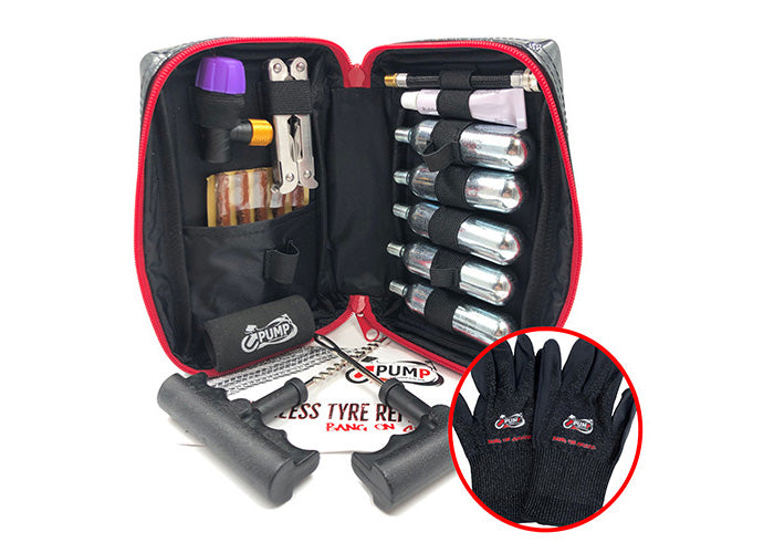 TYRE REPAIR KIT - ESSENTIAL TUBELESS CO2 KIT WITH 5 x 16G CARTRIDGES AND SAFETY MAINTENANCE GLOVES